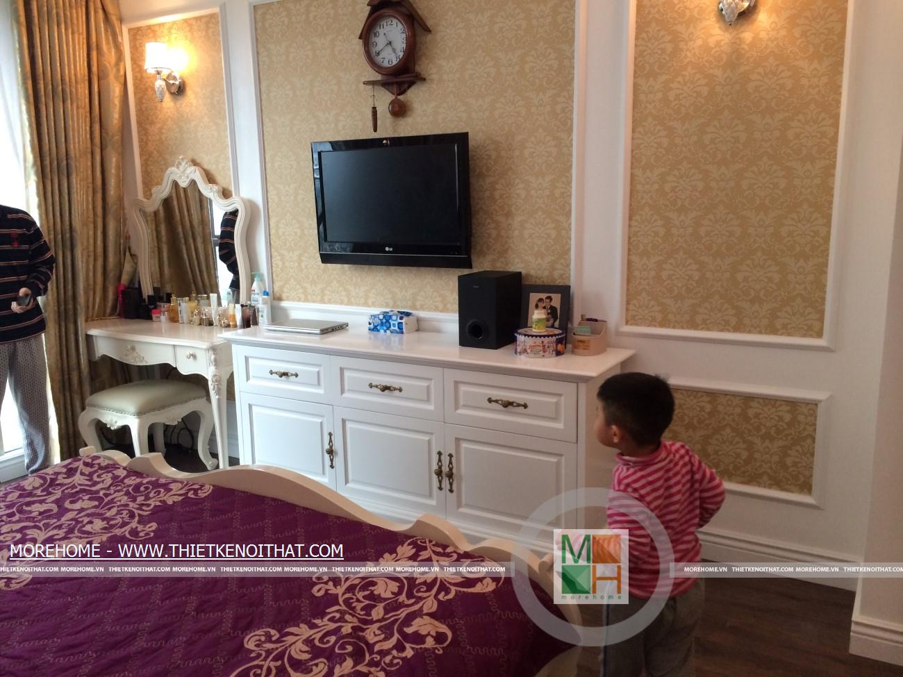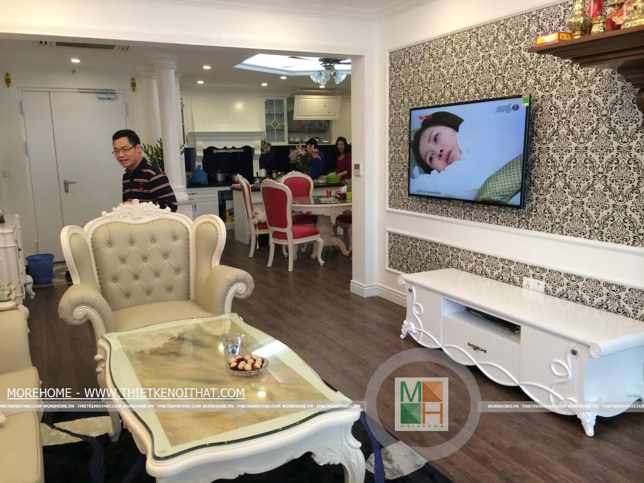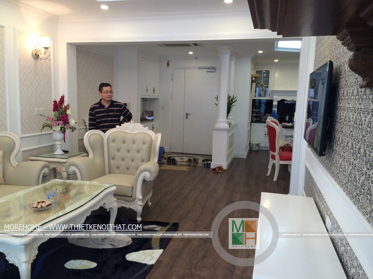 Không gian sống tiện nghi đã giúp gia đình anh Dũng cảm thấy rất hài lòng và thích thú, đây sẽ là nơi tuyệt vời để cả gia đình anh tận hưởng những giây phút thư giãn bên người thân. Thiết kế căn hộ này mang phong cách đương đại. Không cầu kì rườm rà toàn bộ không gian toát lên sự sang trọng và hiện đại, kết hợp với một vài đường nét á đông mang lại sự gần gũi với gia chủ.Hãy cùng Morehome chiêm ngưỡng sự ấn tượng trong mẫu thi công nội thất chung cư Mandarin Garden.
