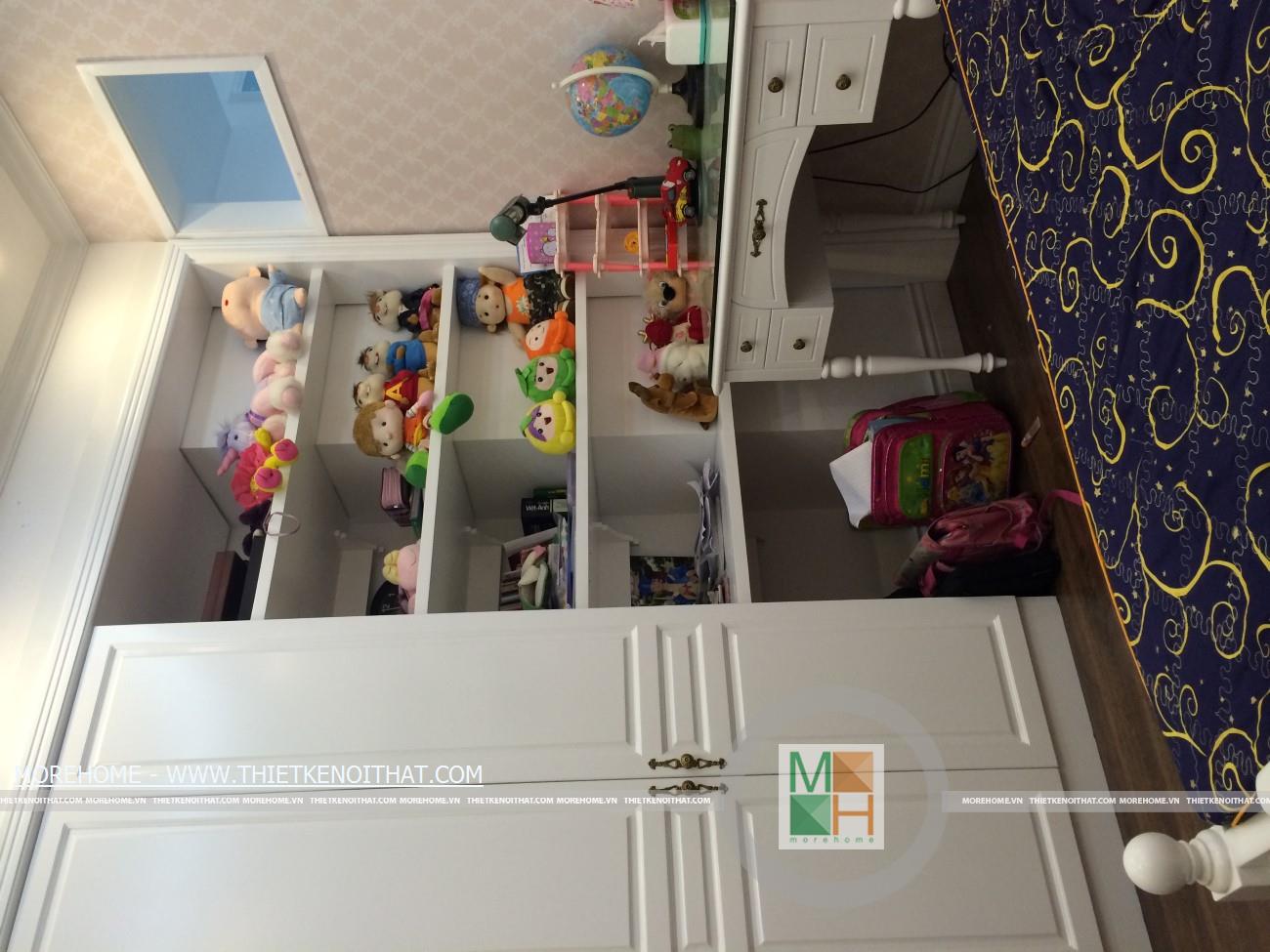 Thiết kế nội thất phòng ngủ cho con của anh Dũng, phong cách có phần mạnh mẽ hơn với những đường thẳng ngang dọc thanh thoát trong thiết kế. Một chiếc tủ tường trưng bày cũng với một chiếc bàn học màu trắng để giúp bé học tập và giải trí một cách dễ dàng. Chiếc giường ngủ với họa tiết ga xoắn ốc tạo sự độc đáo và mới lạ.