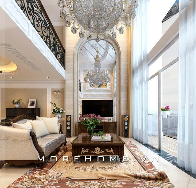 Mẫu thiết kế phòng khách biệt thự cao cấp nội thất tân cổ điển với đường nét tinh tế cùng hệ thống cửa kính cường lực lớn lấy trọn ánh sáng cho căn phòng mang vẻ đẹp sang trọng đẳng cấp
