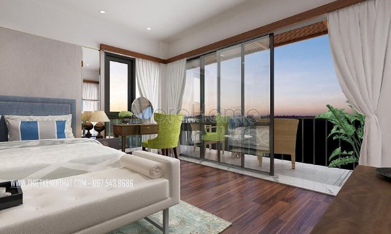 Phòng ngủ biệt thự hiện đại, thông thoáng và sang trọng bởi ý tưởng thiết kế mở từ hệ cửa kính cường lực lớn giúp bạn có thể tận hưởng cảm giác trong lành, ngắm nhìn vẻ đẹp tuyệt vời từ thiên nhiên