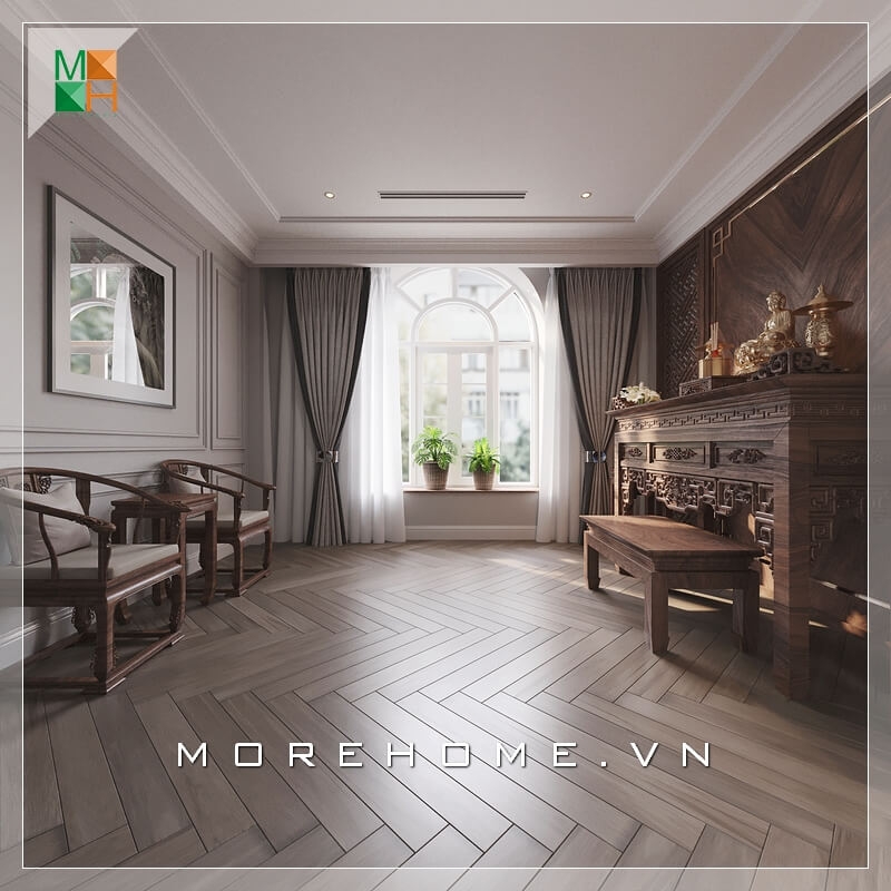 Thiết kế nội thất từ gỗ óc chó cao cấp được lựa chọn cho phòng thờ biệt thự để thể hiện lòng thành tâm của gia chủ.